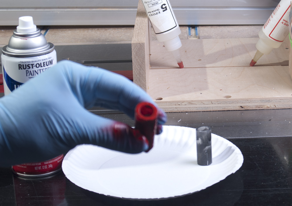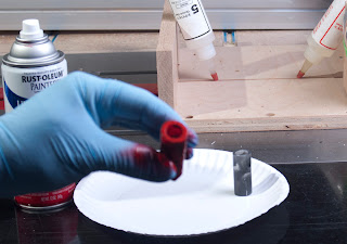In the first photo you see some red spray paint, two part epoxy glue, and nitrile gloves. I hold the blank in my hand while spray painting, and hate getting paint on my hands. The gloves are awesome.